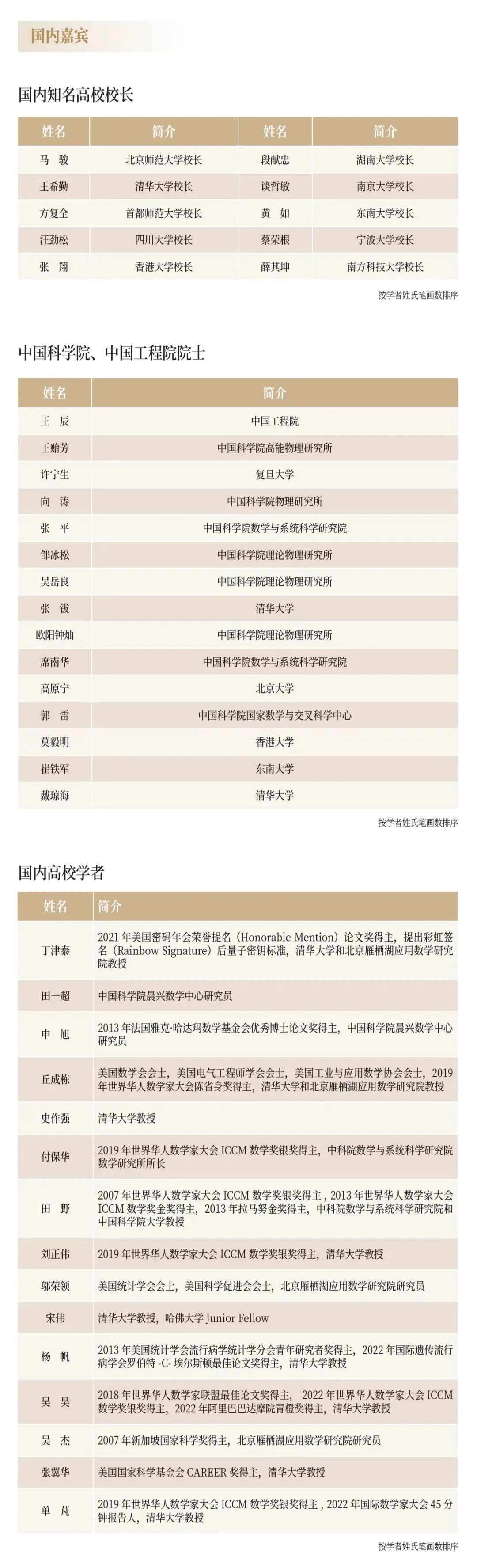 菲尔兹奖得主大卫·曼福德(David Mumford)、马克西姆·孔采维奇(Maxim Kontsevich)、洛朗·拉福格(Laurent Lafforgue)、安德烈·欧克恩科夫(Andrei Okounkov)、考切尔·比尔卡尔(Caucher Birkar)、阿莱西奥·菲加利(Alessio Figalli)、雨果·杜米尼尔·科平(Hugo Duminil-Copin),图灵奖得主约翰·霍普克罗夫特(John E. Hopcroft)、姚期智(Andrew Chi-Chih Yao)、阿迪·萨莫尔(Adi Shamir)、莱斯利·瓦利安特(Leslie G. Valiant)以及诺贝尔奖得主戴维·格罗斯(David Gross)将共同出席大会开幕式。大会主席、菲尔兹奖得主丘成桐对此次大会充满信心和期待,他表示,聚集如此众多世界一流学者来到中国探讨学问,这是科学史上的第一次。“我期待通过这样的大规模学术交流,能够为世界基础科学发展做出贡献。希望国际知名学者,特别是成就卓著的学者,加强对中国的了解。同时,希望年轻学者、学生们积极与世界一流学者交流,从而树立明确的目标。”