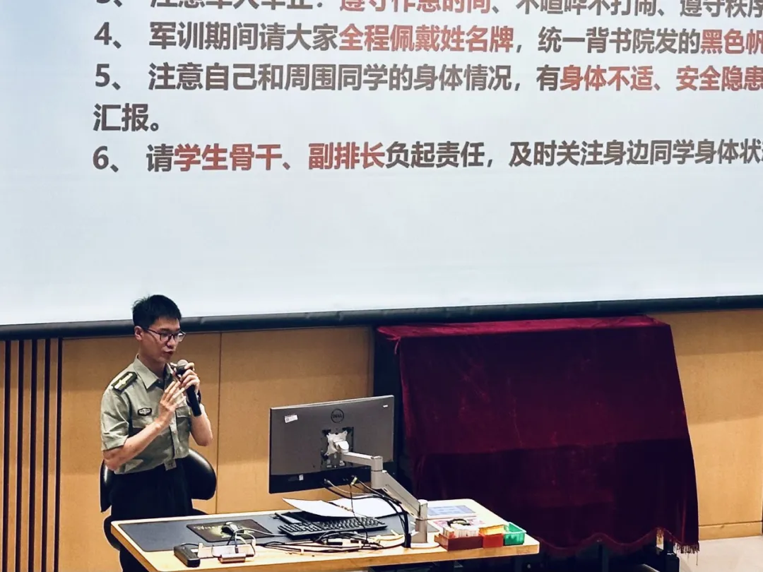 学生军训旅十六连连长兼一排排长胡仁飞教官指出,本次军训不仅是同学们正式进入大学以来的首个试炼,更是对参训同学的身心及能力的一次磨砺与考验。他呼吁同学们在军训的过程中不怕苦、不怕累,磨练意志,强健体魄,为即将开始的大学学习之路和未来的科研之路打好坚实的基础。