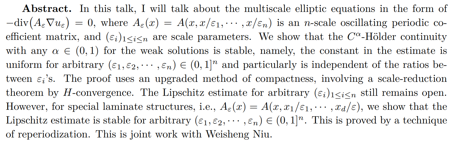 Abstract (摘要): We review some quantitative results in the homogenization of second-order elliptic systems with periodic coefficientsthat oscillate on multiple separated scales. The results include convergence rates and some uniform regularity estimates we obtained recently.