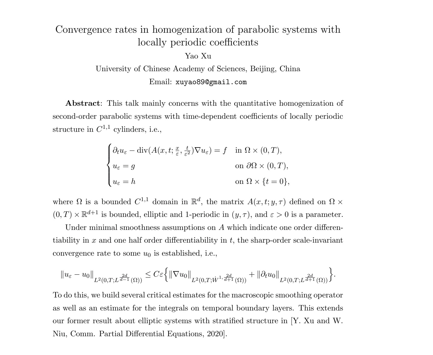 Abstract: This talk is devoted to studying homogenization error for non-stationary Stokes equations on perforated domains, which originally developed by J.-L. Lions. We now present a sharp error estimate in the sense of energy norms, where the main challenge is to control the boundary layers caused by the incompressibility condition. To obtain the optimal error, we first introduce some refined regularity estimates for corrector without compatibility conditions between initial and boundary data, as well as, the well posedness of the effective equations in Bochner space. Then, we further explain how we handle the boundary-layer correctors associated with Bogovskii's operator. This work is cooperated with Dr. Li Wang and Prof. Zhifei Zhang in Peking University.