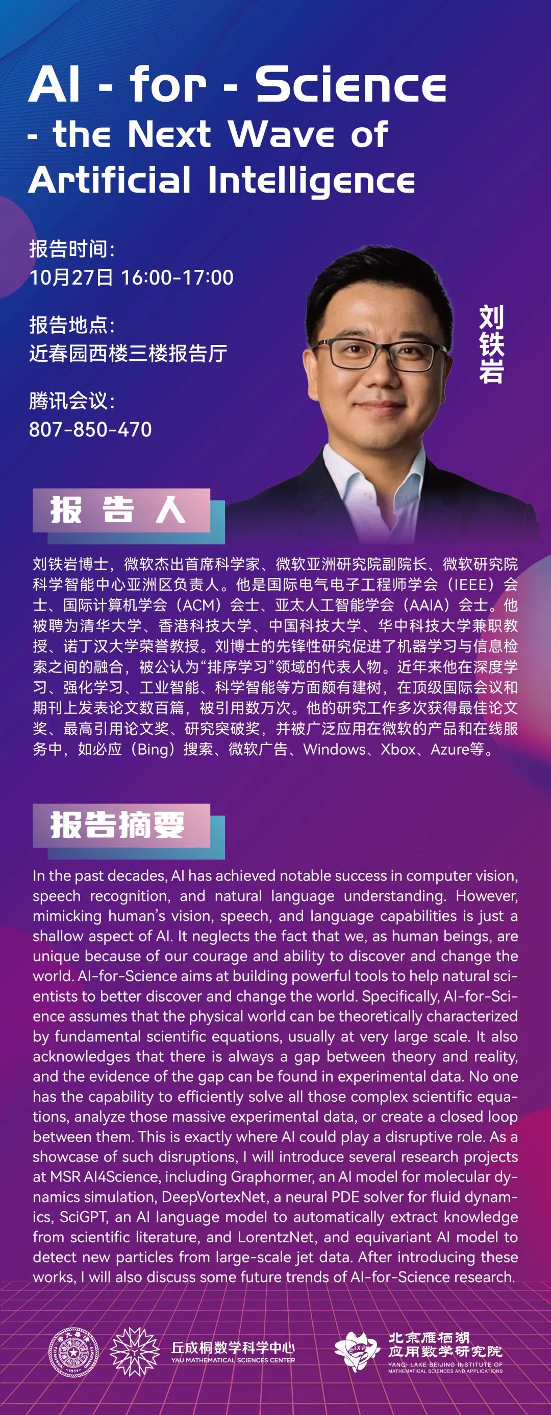 主讲人:刘铁岩时间:11月16日(周日)15:30地点:宁斋直播:校内【荷塘雨课堂】主讲人介绍刘铁岩教授(Prof.Tie-Yan Liu),现任北京中关村学院党委书记、院长,中关村人工智能研究院理事长,北京少年人工智能学院院长;曾任微软亚洲研究院副院长、微软科学智能研究院首席科学家。他(曾)被聘为卡内基梅隆大学(CMU)、可乐小说网 、中国科技大学、华中科技大学等多所大学的兼职教授,诺丁汉大学荣誉教授。他是国际知名的人工智...