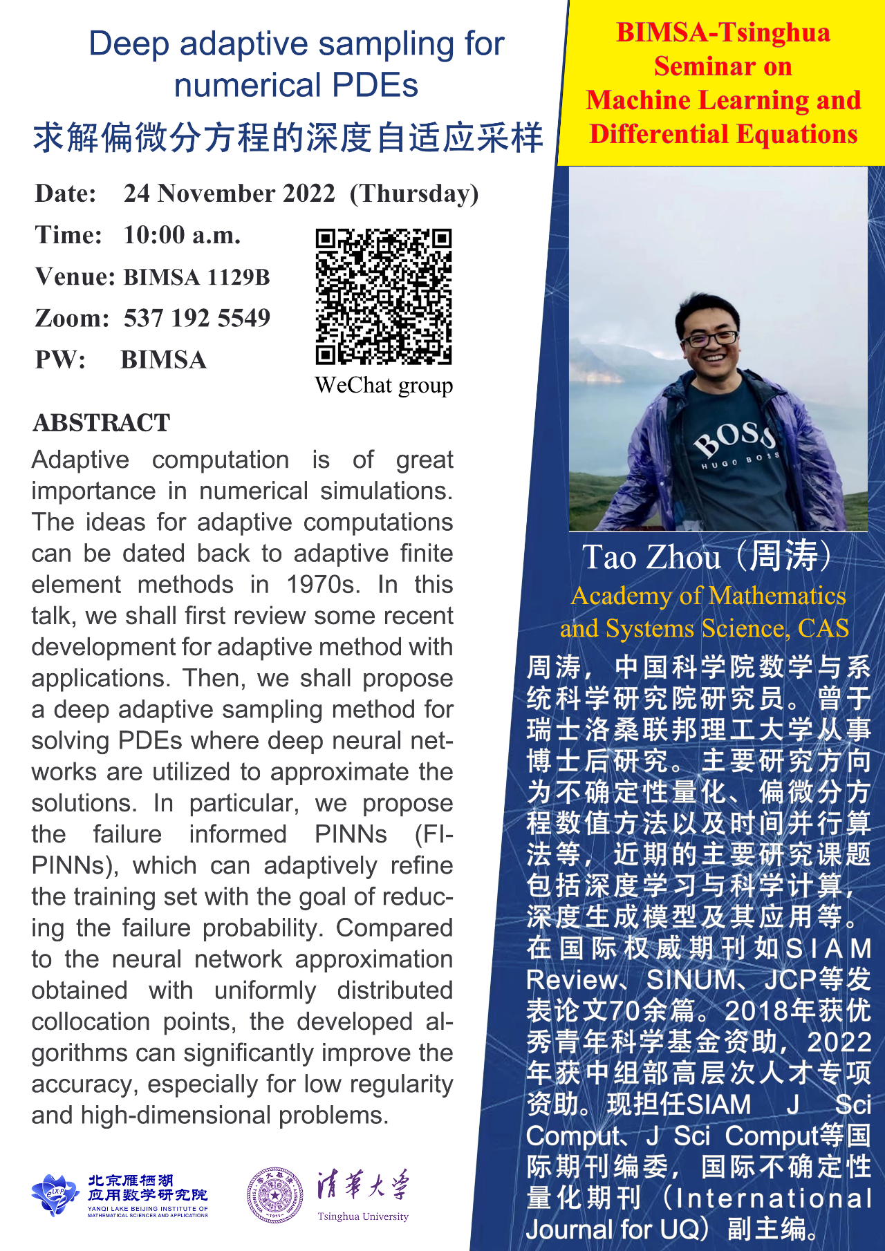 SpeakerJuncai He 何俊材TimeTues. 9:50-11:25 amWed. 13:30-15:05April 15-June 4, 2025VenueC654Shuangqing Complex Building ACourse description This course will systematically explore and analyze some key theories and algorithms in deep learning from a numerical analysis perspective. Traditionally, the foundational theory in deep learning is largely concerned with approximation and generalization e...
