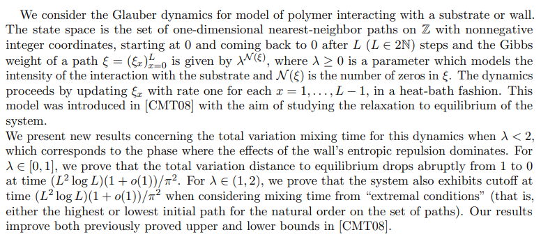 YMSC Probability Seminar 概率论讨论班Organizers:吴昊、杨帆、姜建平、顾陈琳Speaker:Jinjiong Yu 俞锦炯华东师范大学Time:Thur., 15:40-16:40, Dec. 5, 2024Venue:C548, Shuangqing Complex Building ATitle:The critical disordered pinning measureAbstract:A disordered pinning model is called disorder relevant if even arbitrarily small amounts of disorder can qualitatively alter the typical behavior of...