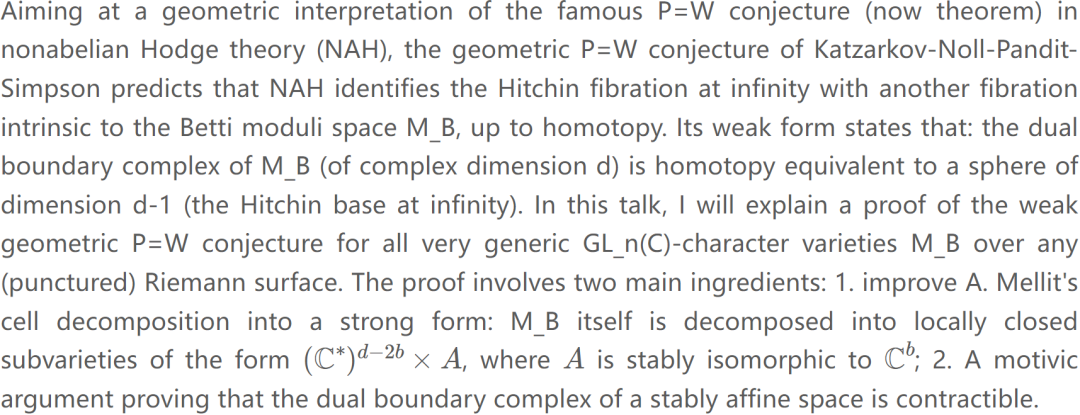 AbstractThe homotopy type conjecture (weak form of geometric P=W conjecture) states that: for any (smooth) Betti moduli space $\mathcal{M}_B$ of complex dimension d over a (punctured) Riemann surface, the dual boundary complex $\mathbb{D}\partial\mathcal{M}_B$ is homotopy equivalent to a sphere of dimension d-1. The main goal of this lecture series is to explain a proof of the conjecture for an...