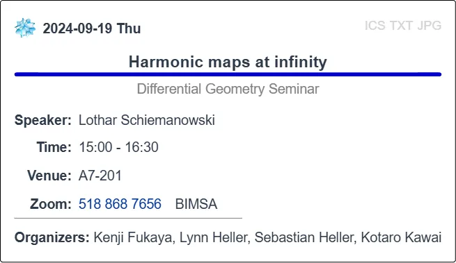 2022-11-21 MonThe $Delta$-twisted homology and fiber bundle structure of twisted simplicial setsBIMSA Topology SeminarSpeaker: Mengmeng Zhang Hebei Normal University and BIMSATime: 15:30-17:00 Venue: 1129B Zoom: 537 192 5549(PW: BIMSA)AbstractIn this talk, I will give a brief introduction for simplicial set theory. Then I will report our recent progress for unifying $delta$-homology, introduc...
