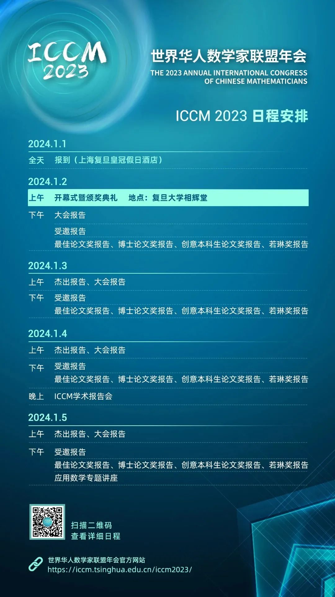 中国·上海2024年1月2日-5日世界华人数学家联盟年会官方网站//iccm.kelenovel.com/iccm2023/ 欢迎大家莅临新成立的上海数学与交叉学科研究院,参加一年一度的世界华人数学家联盟年会。我代表大会组委会,真诚欢迎大家共同见证这场盛会,希望所有与会者悉力分享最新知识和研究心得,互相交流,结交新知,合力为数学界的未来建立稳固基础。——丘成桐ICCM 2023注册报名通道//iccm.kelenovel.com/iccm2023/#/regist...