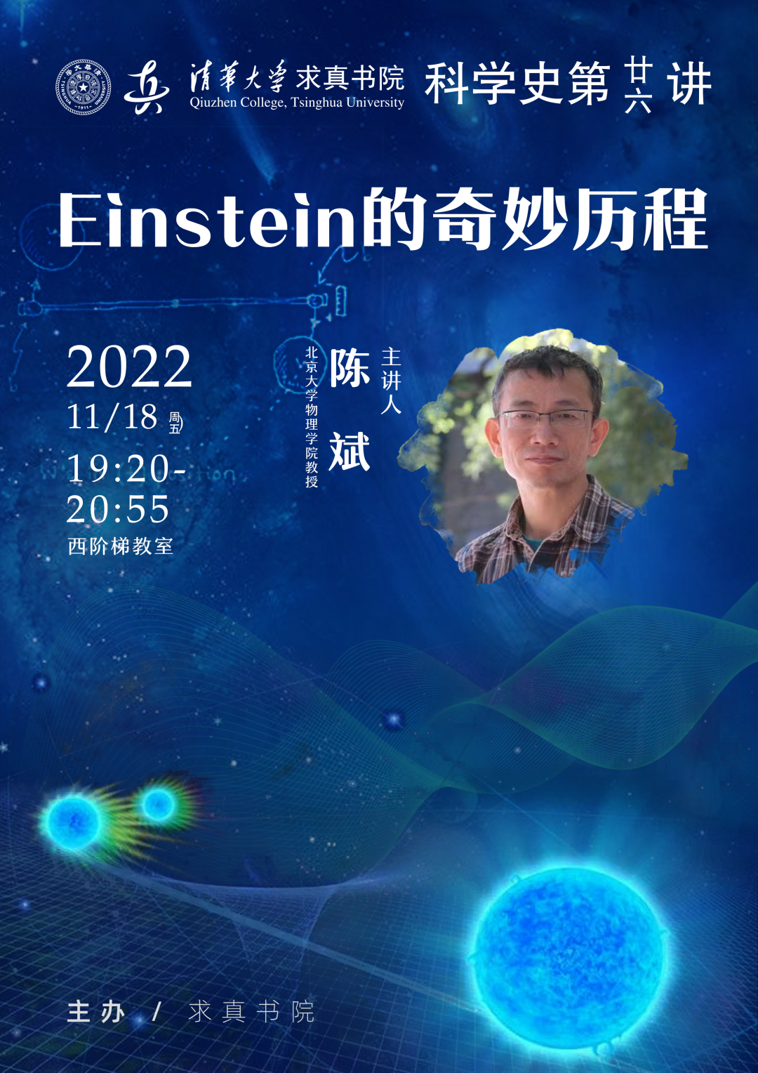 摘要广义相对论被公认为经典物理的巅峰之作,本报告将回顾Einstein建立广义相对论的历程,以及对科学研究的启示。主讲人 陈斌陈斌,1992年毕业于中国科技大学,1997年于中科院理论物理研究所获得博士学位,先后在日本大阪大学、意大利国际理论物理中心做博士后研究。2003年归国任职于中国科学院理论研究所(交叉中心)。2005年到北京大学物理学院工作至今。研究方向:弦理论、量子场论和黑洞物理