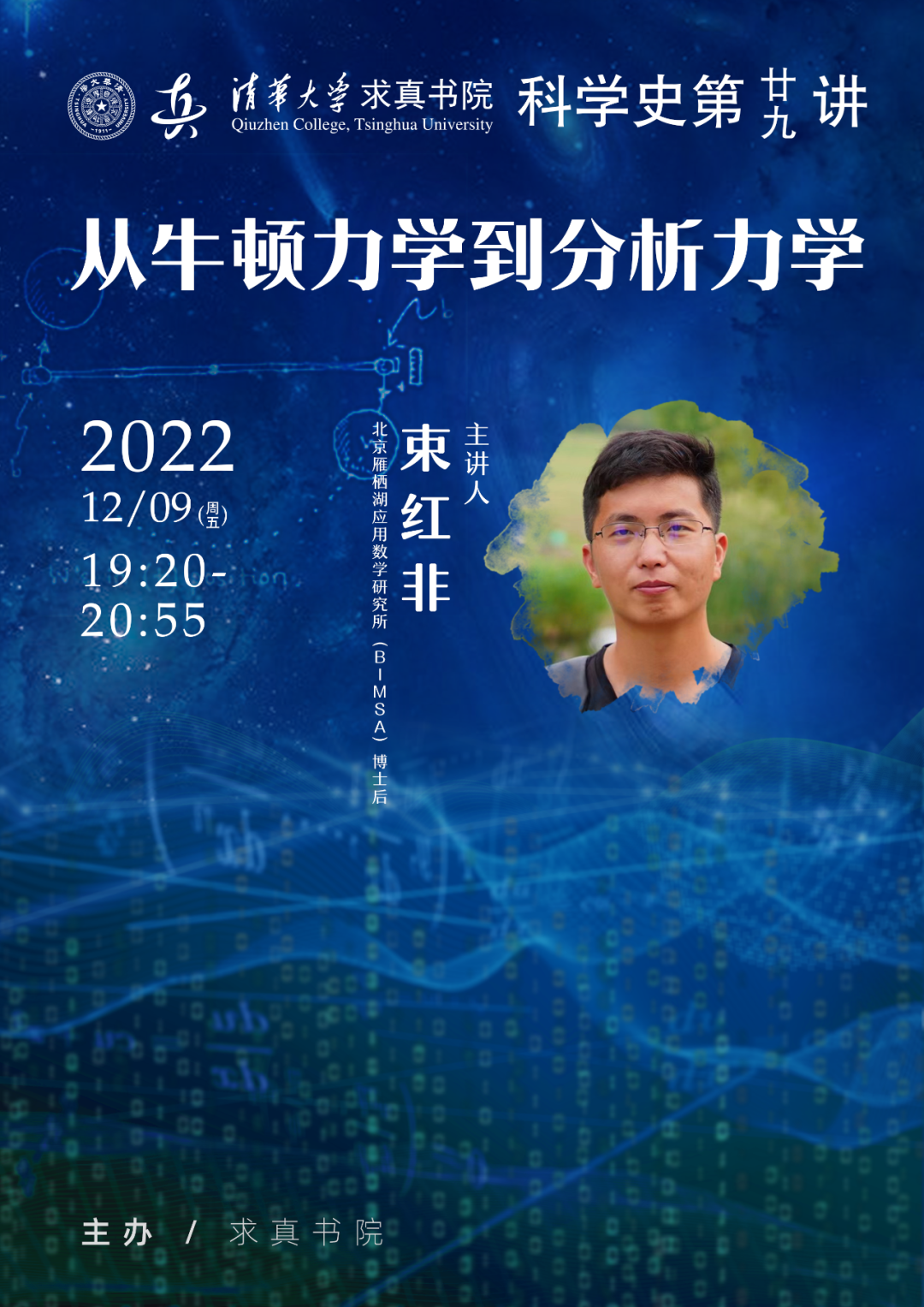 摘要自牛顿出版《自然哲学的数学原理》以来,力学在18,19世纪又一次迎来了发展的巅峰。在这次变革里,力学一改几何的形象化的思维方式,从数学分析的角度来完成了新的定式化。在新的力学里,变分法和极小作用量原理起到了至关重要的作用。在这次报告里,我们将回顾牛顿力学的基本内容,沿着变分法和极小作用量原理的思想脉络,介绍分析力学的形成以及基本思想。主讲人 束红非2019年在日本东京工业大学取得博士学位,2019年-202...